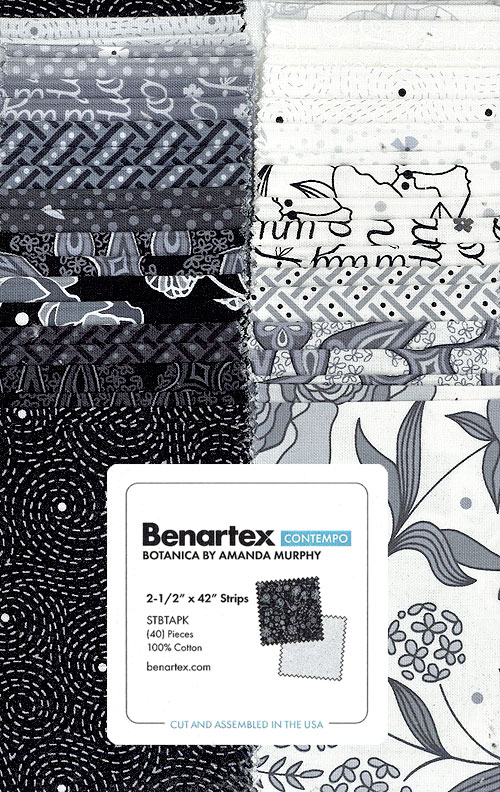 Simple patterns that bespeak a subtle elegance coalesce in this charming collection of black and white precuts. 'Botanica' collection strip pack by Amanda Murphy for Benartex Fabrics, pack includes forty 2-1/2" x 42" strips.