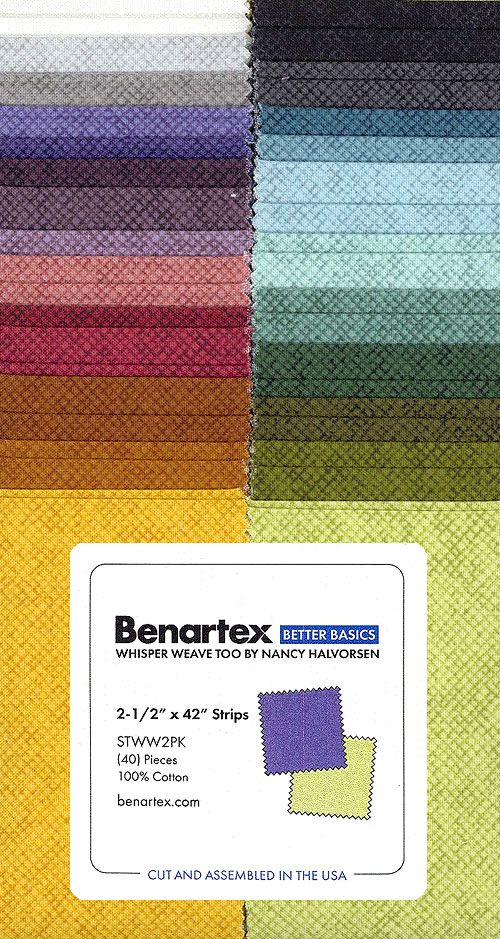 A simple crosshatched pattern is presented in a variety of vivid colors, making a versatile pre-cut that can be used in a wide array of projects! 'Whisper Weave Too' collection strip pack by Nancy Halvorsen for Benartex Fabrics, pack includes forty 2-1/2" x 42" strips.