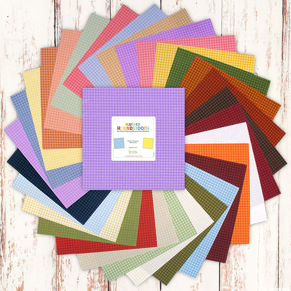 A simple houndstooth pattern is presented in a variety of vivid colors, making a versatile pre-cut that can be used in a wide array of projects! 'Blushed Houndstooth' collection ten-square pack by Cheryl Haynes for Benartex Fabrics. Pack includes forty-two 10" x 10" squares.