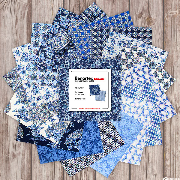 A charming mix of regal medallions and elegant filigree coalesces in this exquisite pre-cut. 'Bluesette' collection ten-square pack by Jan Shore for Benartex Fabrics. Pack includes forty-two 10" x 10" squares.