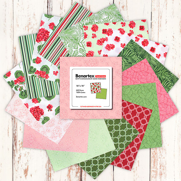 Lush Florals and leafy fronds make for an adventurous garden-themed collection of fabrics in this delightful pre-cut! 'Betty's Geraniums' collection ten-square pack by Jackie Robinson for Benartex Fabrics. Pack includes forty-two 10" x 10" squares.