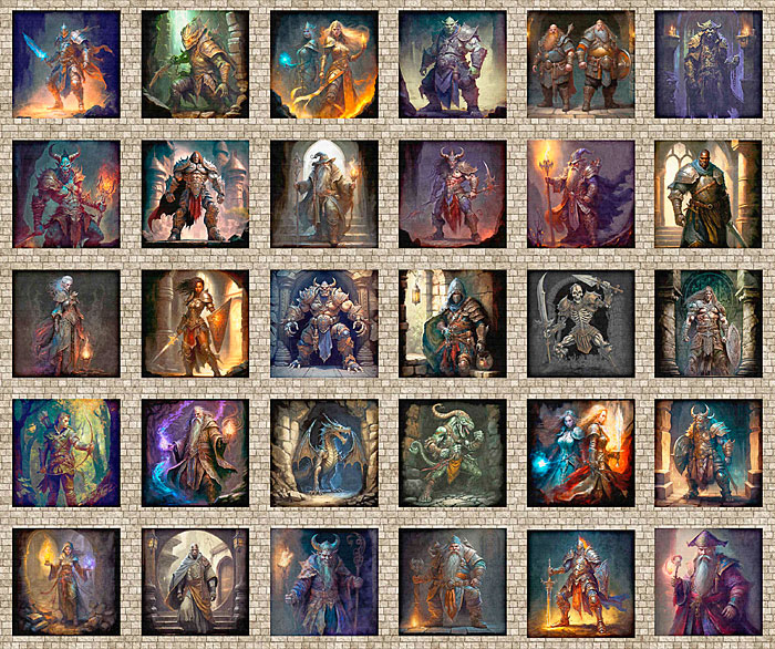 A colorful assortment of various fantasy characters are framed within panel blocks including knights, goblins, orcs, ogres, mages, rangers, rogues, dwarves, demons, and lizardmen. Digitally printed, 36" panel, panel has thirty frames about 6" x 6", from the 'Wizards & Warriors' collection by Dan Morris for Quilting Treasures.