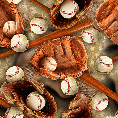Depicted against a background of patriotic stars are various pieces of baseball equipment including baseballs, bats, and catching mitts. Larger gloves are about 4", 'Baseball Stars' by David Textiles.