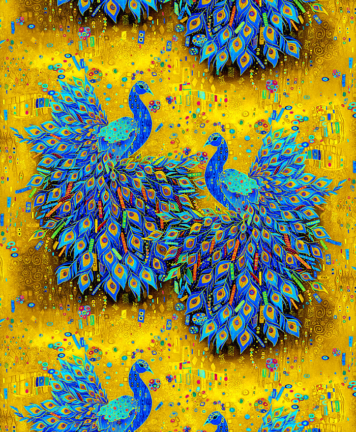 Royal peacocks strut in style across this painterly design reminiscent of Gustav Klimt's style. Peacocks are about 9-1/2", with gold metallic, 'Royal Peacocks' from the 'Gilded Plume' collection by Chong-A Hwang for Timeless Treasures.
