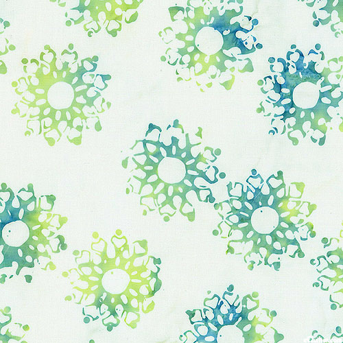 Delicate snowflakes floating gently in the frigid winter air are depicted in vivid hues within mottled batik textures. Batik, larger medallions are about 2-1/2", from the 'Breezy Brights' collection by Jacqueline de Jonge for Anthology Fabrics.
