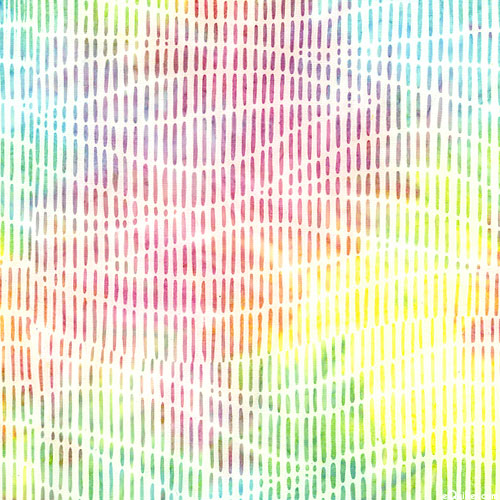 A crosshatching of straight and wavy lines is depicted in vivid hues within mottled batik textures. Batik, longer lines are about 3/4", from the 'In Stitches' collection by Anthology Fabrics.