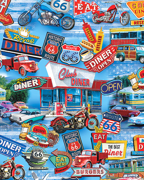 A collection of iconic road, motel, and diner signs as well as several vintage cars and motorcycles from Route 66 are scattered across the design. Digitally printed, larger diners are about 8-1/4", 'American Diners' from the 'America's Highway' collection by Kanvas Studio for Benartex.