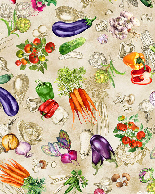 With some grayed out and others colored, a collection of various vegetables are scattered across the design including eggplants, cabbages, tomatoes, artichokes, broccoli, turnips, carrots, onions, peas, mushrooms, radishes, and asparagus. Digitally printed, larger vegetables are about 4-1/4", 'Farm Fresh' from the 'Fresh and Local' collection by Michael Miller Fabrics.