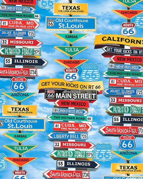Iconic road & motel signs from Route 66 are scattered across the design. Digitally printed, larger signs are about 4-1/2", 'Route 66 Destinations' from the 'America's Highway' collection by Kanvas Studio for Benartex.