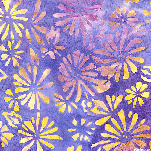 Lush florals blooming in the warmth of the sun are depicted in vivid hues within mottled batik textures. Batik, larger flowers are about 2-1/2", 'Gerber' from the 'Bali Palettes Rainbow' collection by Benartex Fabrics.