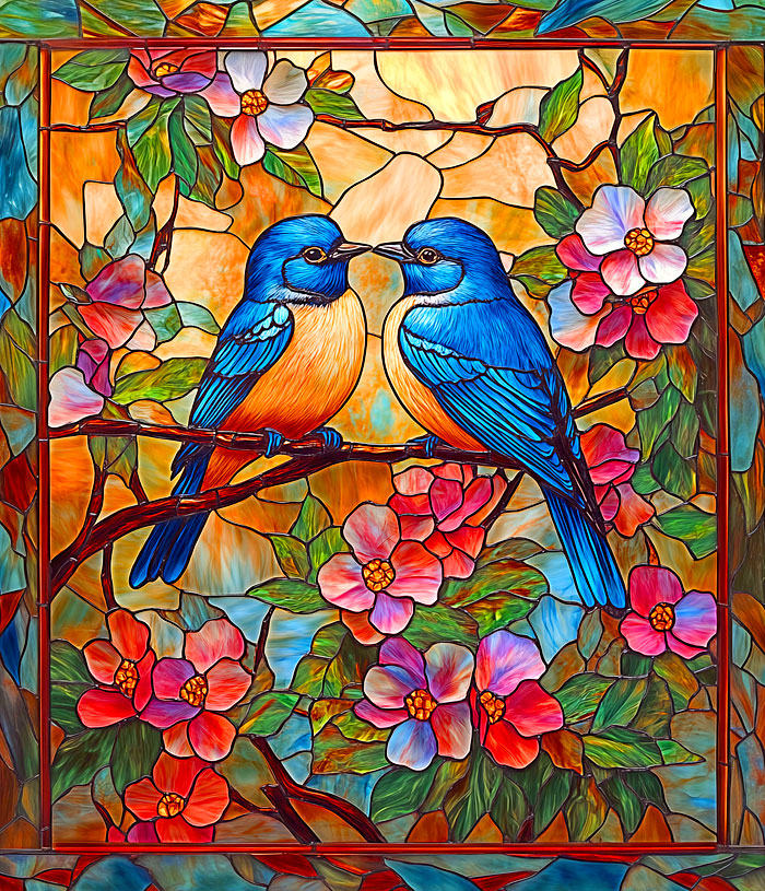 A romantic pair of birds perched on a flowery tree branch are depicted in a charming stained glass style across this elegant panel. Digitally printed, 37" panel, 'Stained Glass Birds' by the Rubin Design Studio, designed exclusively for eQuilter.
