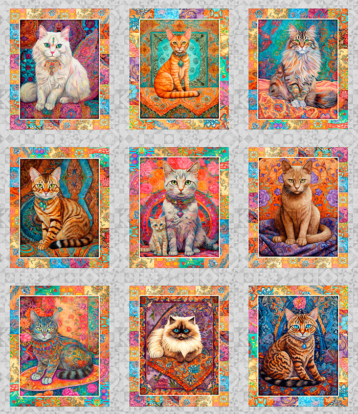 Framed within assorted panel blocks are various regal depictions of majestic kitties stylized in a unique and vibrant art style. Digitally printed, 36" panel, panel has nine frames about 10" x 12", from the 'Quilt Room Kitties' collection by Dan Morris for Quilting Treasures.