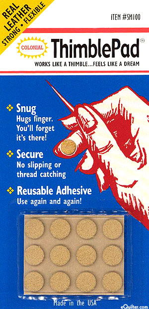 Works like a thimble...feels like a dream! Helps to protect fingers, increase speed, and have lasting comfort. Leather strength, with reusable adhesive. Adhesive thimble pads sold by the twelve pack.