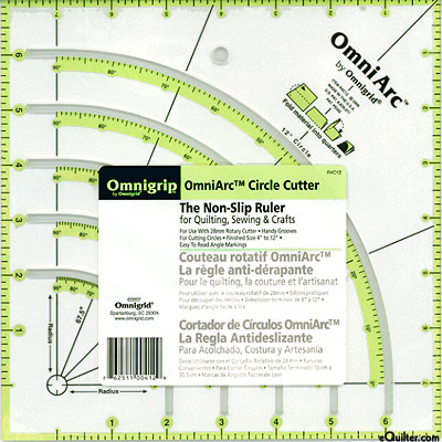 Omnigrip OmniArc Circle Cutter, The Non-Slip Ruler for Quilting, Sewing & Crafts. For use with 28mm rotary cutter, handy grooves for cutting circles, finished circle sizes 4" to 12", easy to read angle markings.