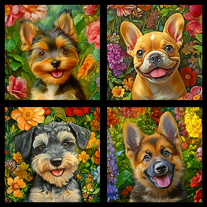 Panel blocks contain imagery of cute and cuddly puppies poking their head through the verdant foliage of a lush and flowery forest. Digitally printed, 43" panel, includes four 19-1/2" x 19-1/2" frames, 'Floral Puppies Pillow Panel 2' by the Rubin Design Studio, designed exclusively for eQuilter.