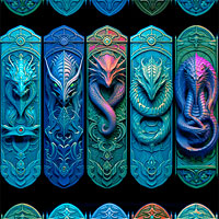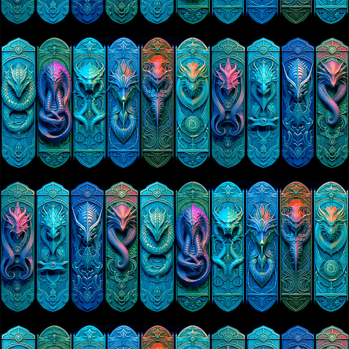 Totemic dragon emblems are arranged in rows across the design, each intricately and meticulously etched to show off the vivid and stunning detail of the majestic beasts. Digitally printed, Dragon frames are about 2-1/2" x 9 3/4", stripes run the length of the fabric, includes four stripes from selvedge edge to selvedge edge, 'Dragon Icon Stripes' by the Rubin Design Studio, designed exclusively for eQuilter.