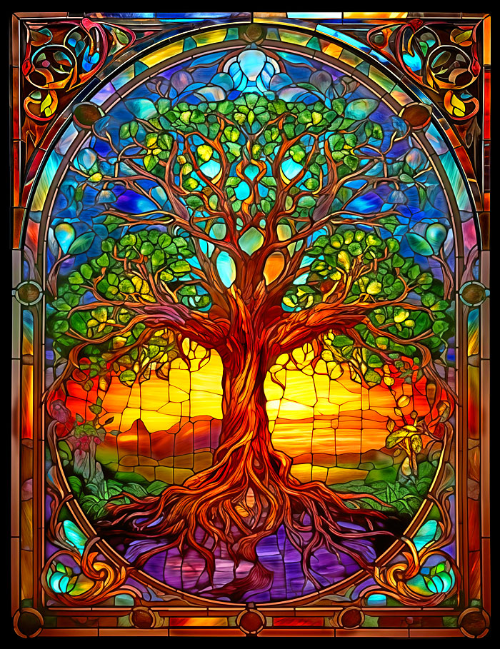 A stained glass rendition of the tree of life comes to life as a mesmerizing mosaic full of color shimmers across this picturesque panel. Digitally printed, 33" panel, 'Illuminated Stained Glass Tree of Life' by the Rubin Design Studio, designed exclusively for eQuilter.