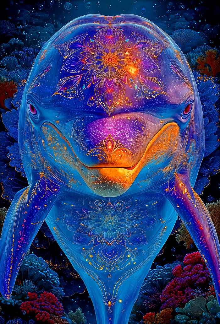 From the bubbling depths of the ocean, the captivating shape of an intricately adorned dolphin emerges from delicately illustrated patterns reminiscent of those found in mandalas and zentangle designs. Digitally printed, 29" panel, 'Dazzling Dolphin' by the Rubin Design Studio, designed exclusively for eQuilter.