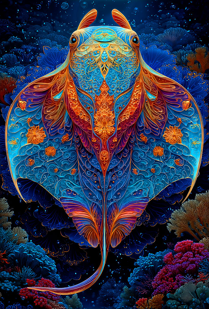 From the bubbling depths of the ocean, the captivating shape of an intricately adorned manta ray emerges from delicately illustrated patterns reminiscent of those found in mandalas and zentangle designs. Digitally printed, 29" panel, 'Manta Ray' by the Rubin Design Studio, designed exclusively for eQuilter.