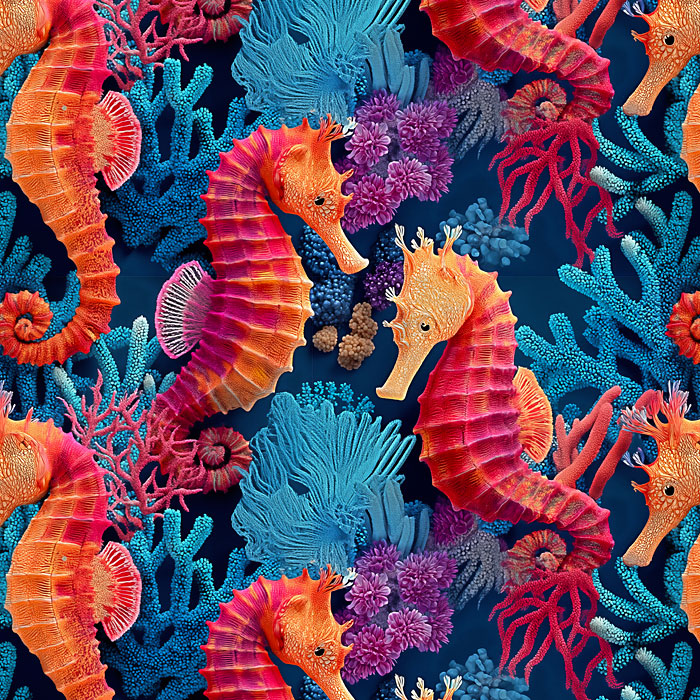 Seahorses floating gently among a colorful outcrop of vibrant coral reef lend an aquatic allure to this dazzling design. Digitally printed, seahorses are about 4-1/2", 'Spectacular Seahorses' by the Rubin Design Studio, designed exclusively for eQuilter.