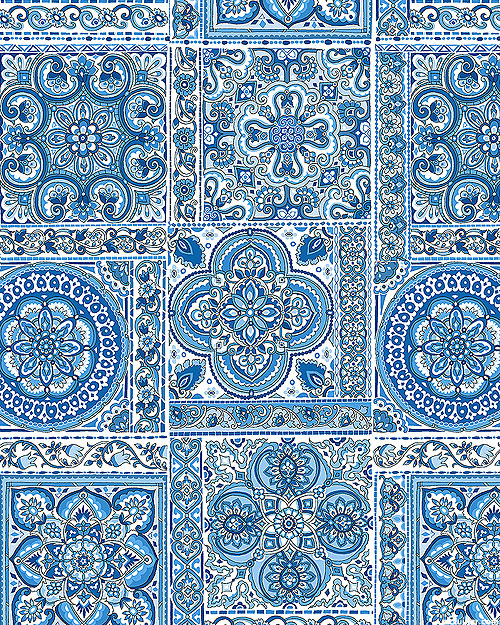 Intricate circular and floral designs decorate these Mediterranean-inspired tiles. Larger tiles are about 3-1/4", 'Bluesette Tiles' from the 'Bluesette' collection by Jan Shore for Benartex Fabrics.