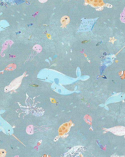A collection of various marine animals swim across the design including whales, seals, turtles, pufferfish, jellyfish, narwhals, and seahorses. Digitally printed, larger whales are about 3-1/2", from the 'Marine Delights' collection by Samantha Neville for Robert Kaufman Fabrics.