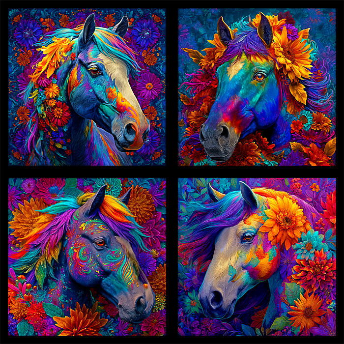A collection of four flowery portraits of wild horses come to life in bright painterly hues across this picturesque panel. Digitally printed, 43" panel, includes four 20" x 20" frames, 'Horse Lightning Pillow Panel' by the Rubin Design Studio, designed exclusively for eQuilter.