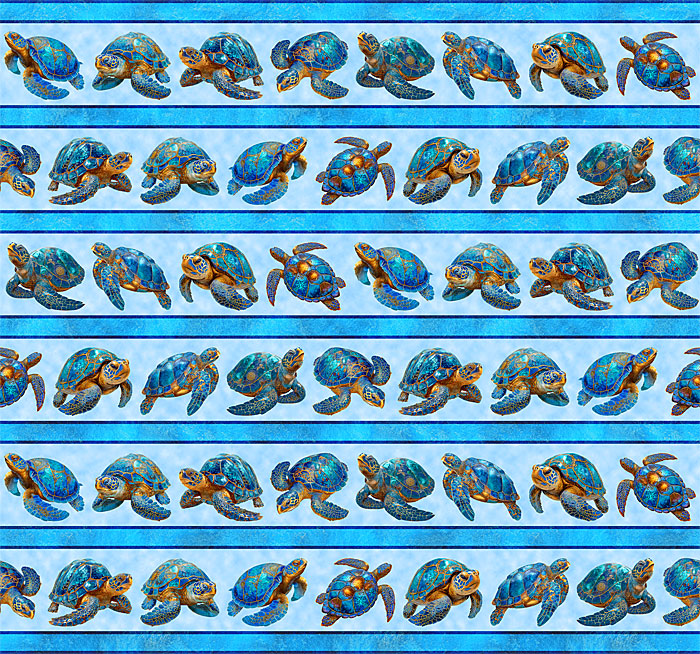 Sea turtles swimming in the ocean create a mesmerizing masterpiece of maritime magnificence between the layers of this dazzling stripe. Digitally printed, wider stripes are about 5-1/4", stripes run the length of the fabric, includes six stripes from selvedge edge to selvedge edge, 'Bejeweled Sea Turtles Stripe' by the Rubin Design Studio, designed exclusively for eQuilter.