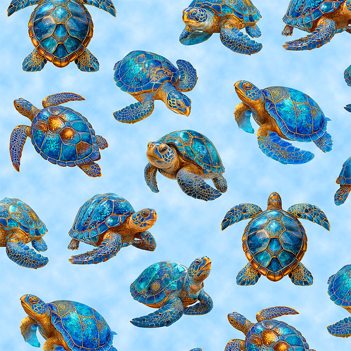 Sea turtles swimming in the ocean create a mesmerizing masterpiece of maritime magnificence across this enchanting design. Digitally printed, sea turtles are about 3-1/4", 'Bejeweled Sea Turtle Allover' by the Rubin Design Studio, designed exclusively for eQuilter.