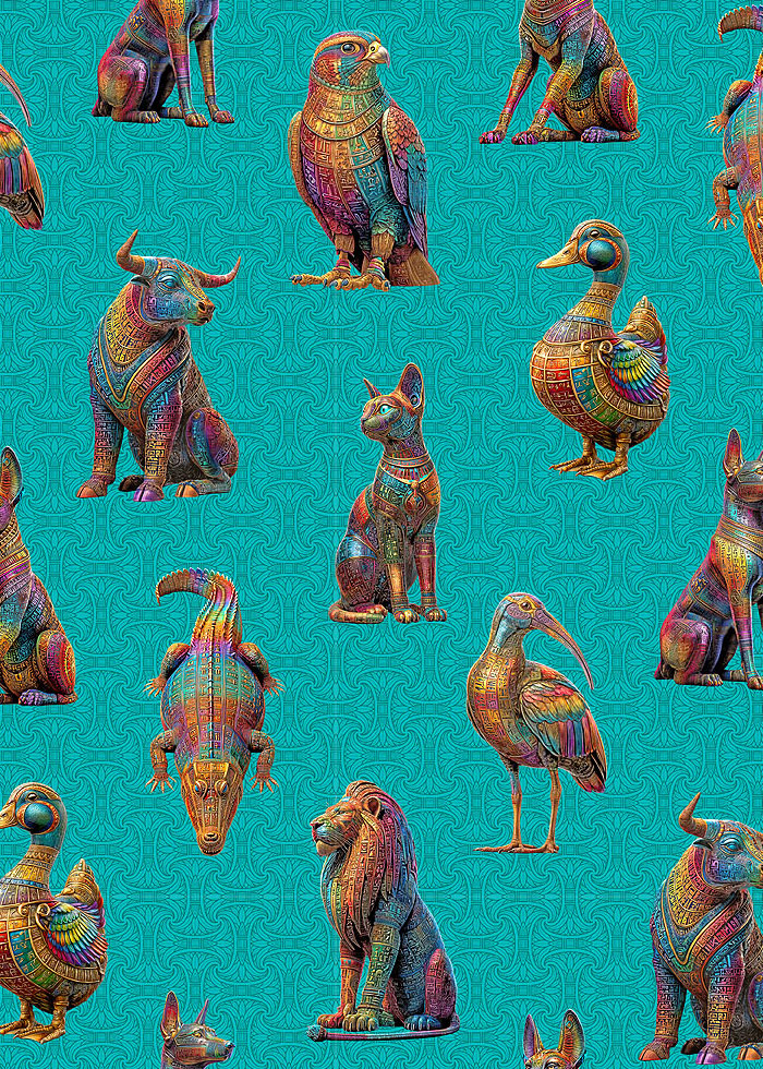 Ancient and elegant statues of animals are scattered against an intricate and textural background in this Egyptian-themed design. Digitally printed, Egyptian animals with hieroglyphs are about 3-1/2", 'Iridescent Egyptian Animals Allover' by the Rubin Design Studio, designed exclusively for eQuilter.