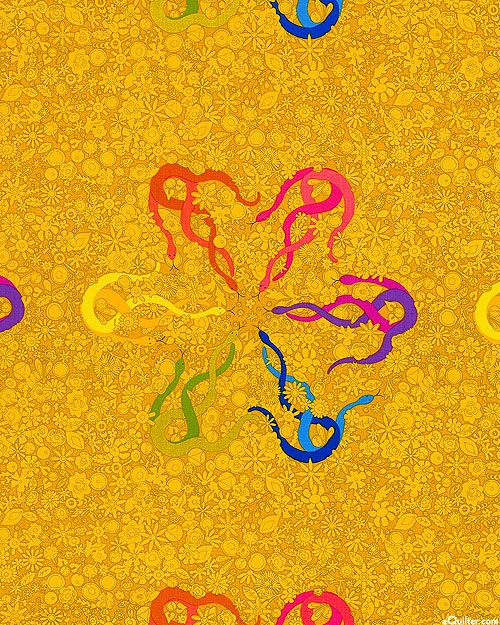 Colorful snakes tangle together into knotted shapes resembling flowery mandalas. Wreath of snakes is about 9-1/2", from the 'Wildflowers' collection by Alison Glass for Andover Fabrics.