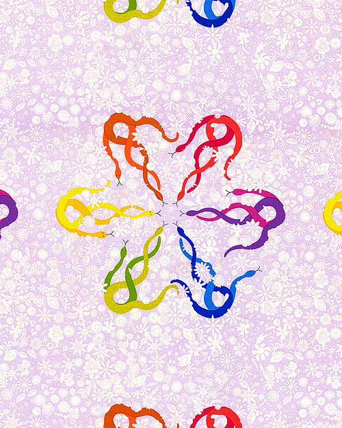 Colorful snakes tangle together into knotted shapes resembling flowery mandalas. Wreath of snakes is about 9-1/2", from the 'Wildflowers' collection by Alison Glass for Andover Fabrics.