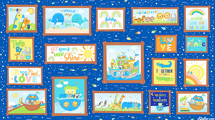 Panel blocks contain wholesome phrases and imagery of animal pairs riding on Noah's ark including whales, giraffes, tigers, monkeys, lions, and alligators. 24" panel, 'Noah's Journey Boxes' from the 'Noah's Journey' collection by Kanvas Studio for Benartex Fabrics.
