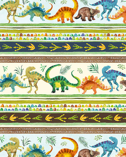 A variety of colorful dinosaurs are scattered across the design including Brontosaurus, Stegosaurus, Triceratops, and Velociraptors. Digitally printed, wider stripes are about 2-1/2", stripes run the length of the fabric, 'Dino Kingdom Stripe' from the 'Wild One' collection by Michael Miller Fabrics.