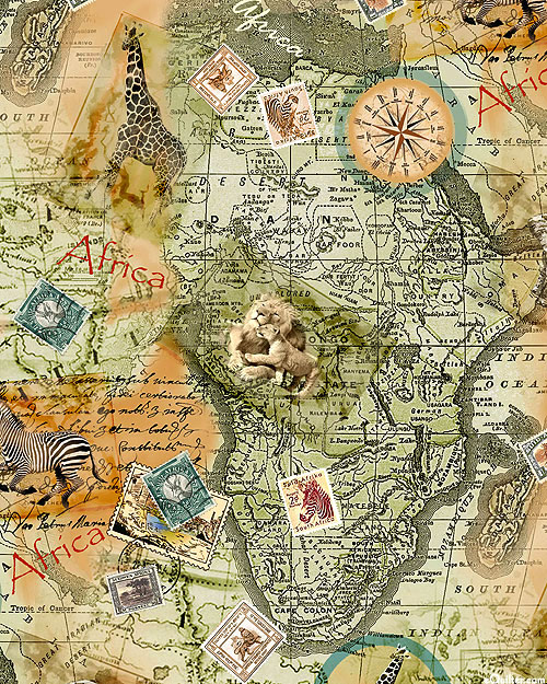 A map of Africa sits in the background of this fabric, with compasses, postal stamps, and images of various safari animals adding to the design. Digitally printed, larger postcards are about 5-1/4", 'African Adventure' from the 'Serengeti Plains' collection by Michael Miller Fabrics.