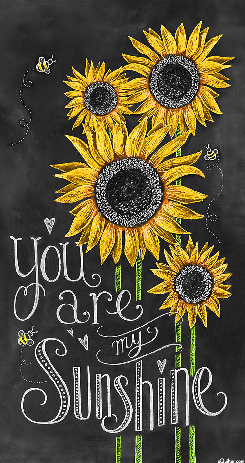 In this panel, honeybees buzz between a trio of sunflowers as the words, "you are my sunshine" are written out beneath. Digitally printed, 24" panel, 'You Are My Sunshine Panel' from the 'Flower Market' collection by Lily & Val for Michael Miller Fabrics.