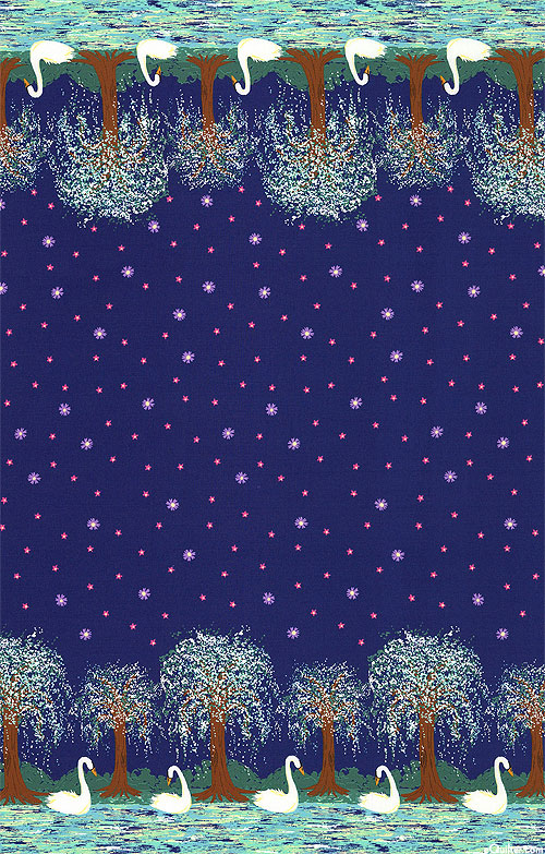 Graceful swans float on a painterly sea under weeping willows in full bloom along both selvedges. Small blossoms rain down creating a design perfect for apparel and home dec projects. Taller trees are about 6 1/2", 'Swan Lake' from the 'Swan Lake' collection by Michael Miller Fabrics.