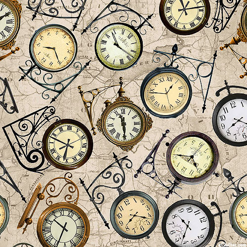 Old clocks tossed against a background of faded parchment lends a retro charm to this vintage design. Larger clocks are about 2-1/4", 'Hurry Up' from the 'All Aboard' collection by Michael Miller Fabrics.