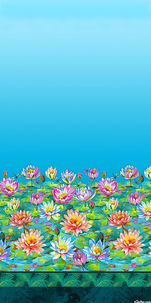 In this single border print, A painterly scene reveals a lush water garden full of lotus florals and lily pads. Digitally printed, single border print, larger flowers are about 5", 'Water Lily Single Border' from the 'Water Lilies' collection by Michael Miller Fabrics.