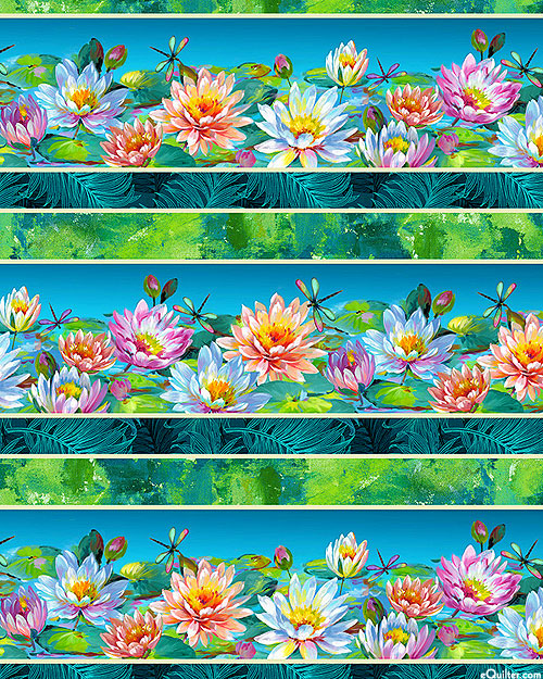 Dragonflies flutter to and fro between a lush water garden full of lotus florals and lily pads. Digitally printed, wider stripes are about 3-3/4", stripes run the length of the fabric, 'Water Lily Stripe' from the 'Water Lilies' collection by Michael Miller Fabrics.