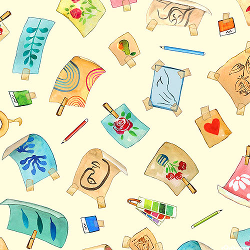 Pieces of paper featuring small painting doodles are scattered across this artsy design. Digitally printed, larger papers are about 2", 'Sketches' from the 'An Artist's Life' collection by Louise Nisbet for Michael Miller Fabrics.