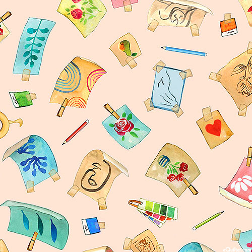 Pieces of paper featuring small painting doodles are scattered across this artsy design. Digitally printed, larger papers are about 2", 'Sketches' from the 'An Artist's Life' collection by Louise Nisbet for Michael Miller Fabrics.