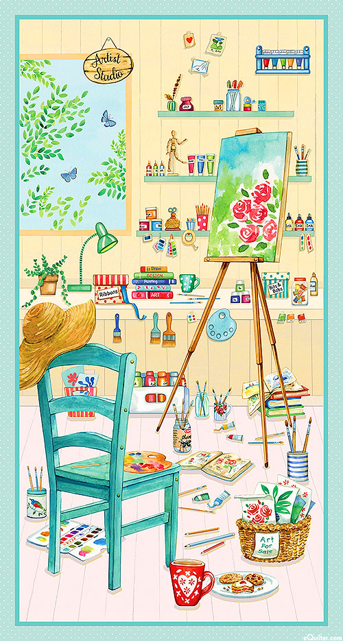 In this panel, a charming studio space is filled with art supplies, an afternoon snack, and an in-progress painting. Digitally printed, 24" panel, 'Artist's Workroom Panel' from the 'An Artist's Life' collection by Louise Nisbet for Michael Miller Fabrics.