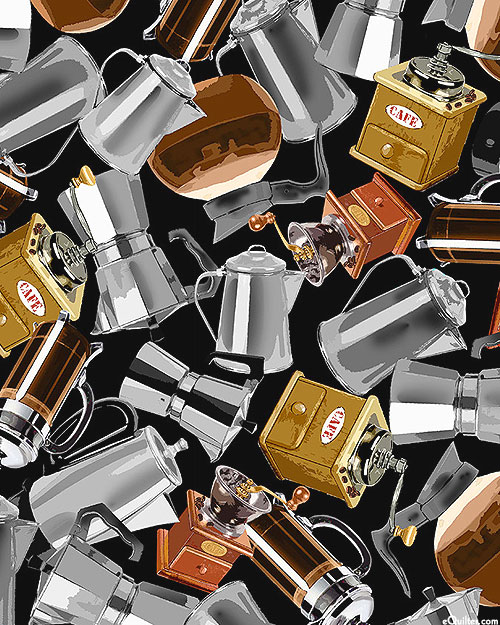 Various tools used in the process of brewing coffee are scattered across the design including coffeepots, coffee bean grinders, moka pots, and kettles. Digitally printed, larger coffee pots are about 3-1/2", 'Coffee Brewing' from the 'Espresso Yourself' collection by Michael Miller Fabrics.