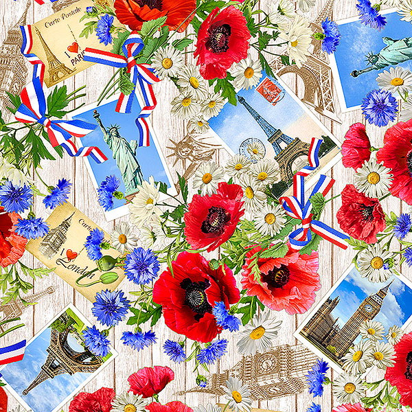 Lush florals are scattered between a mix of postcards from around the world including pictures of Big Ben, the Statue of Liberty, and the Eiffel Tower. Digitally printed, larger postcards are about 5", 'Summer Romance' from the 'Summer Wildflowers' collection by Michael Miller Fabrics.