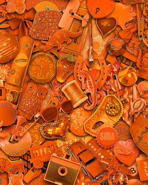 A kitschy spread of various odds and ends are scattered across this dazzling tonal design. Digitally printed, larger objects are about 4-1/2", from the 'Living Color' collection by Aimee Stewart for Michael Miller Fabrics.
