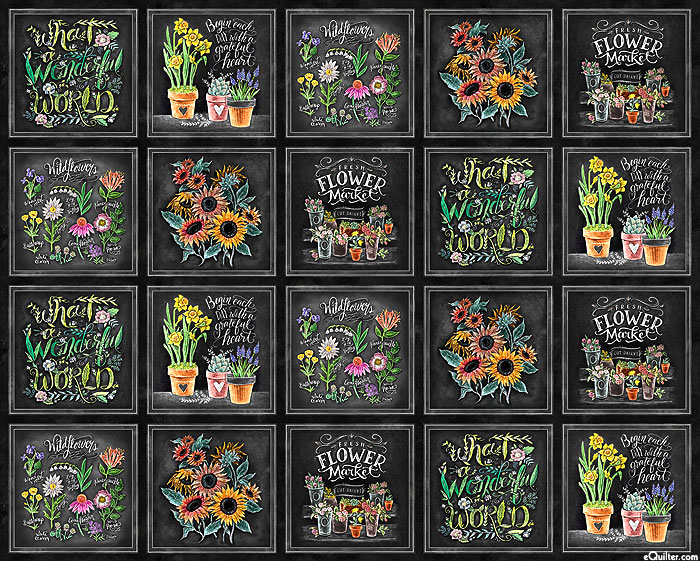 Framed within assorted panel blocks are a collection of chalk drawings featuring elegant florals and signs advertising for flower shops. Digitally printed, 34" panel, panel has twenty frames about 8" x 8", 'Happiness Blooms' from the 'Flower Market' collection by Lily & Val for Michael Miller Fabrics.