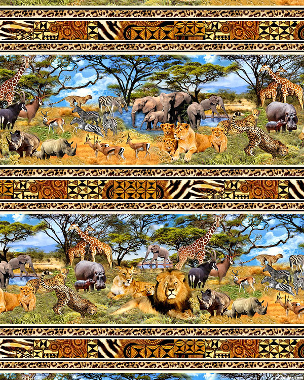A wide variety of safari animals such as rhinos, giraffes, zebras, gazelles, lions, elephants, cheetahs, and hippos gather and lounge around a watering hole, with tribal patterns separating the different layers of this unique stripe. Digitally printed, wider stripes are about 6-3/4", stripes run the length of the fabric, 'Savanna Panorama' from the 'Serengeti Plains' collection by Michael Miller Fabrics.