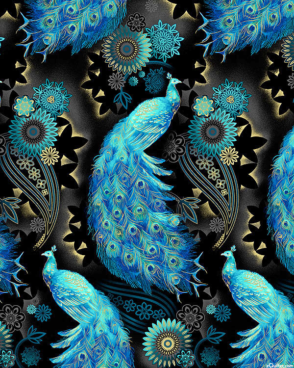 Peacocks exuding unmatched elegance in the brilliant patterns along the length of their plumage rest gently within a vibrant floral garden. Larger peacocks are about 13", with gold metallic, 'Peacock Dance' from the 'Magnificent Peacock' collection by Michael Miller Fabrics.