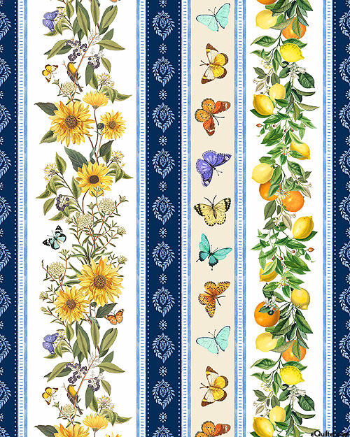 Butterflies, sunflowers, and butterflies are layered together in this stunning striped design. Digitally printed, wider stripes are about 3-1/4", stripes run the length of the fabric, 'Lemon And Sunflower Stripe' from the 'Mediterranean Riviera' collection by Bloomery Decor for Michael Miller Fabrics.